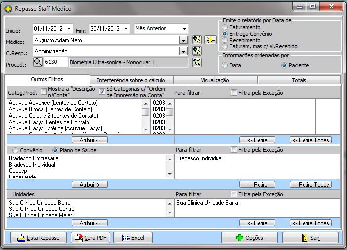 | Por Plano de Saúde, convênio, unidade |