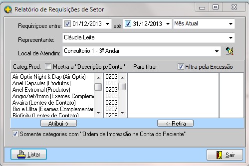 | Categ. Prod./Mostra a "Descrição p/ Conta | ao marcar esta opção o relatório incluirá todas as categorias de produtos relacionadas ao paciente, se desmarcada possibilita filtrar por categoria de produto. |