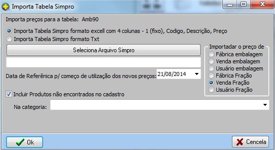 | Selecione o formato que deseja importar > Seleciona o Arquivo Simpro > Defina o Preço que deseja importar > Selecione a data de referencia para começar a utilizar os preço > Informe em qual categoria de produtos deseja importar> Ok. |