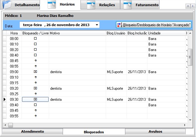 - Como bloquear horário: clique no quadrado correspondente ao horário que se deseja bloquear ou clique na coluna "Bloqueado/Livre". Preencha, opcionalmente, o motivo do bloqueio e um "x" será marcado, indicando o bloqueio do(s) referido(s) horário(s).