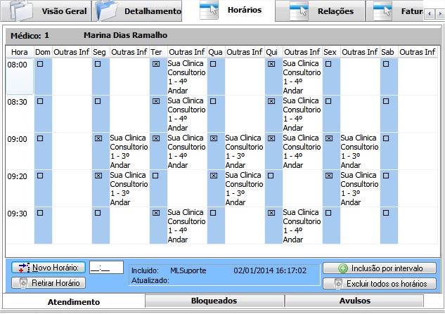 - Como desmarcar horário de atendimento: para desmarcar um dia da semana, basta clicar no quadrado com o "x" e deixá-lo em branco e para excluir um horário de atendimento, basta selecioná-lo e clicar no botão "Retira Horário". Ou clique em Excluir todos os horários, ao fazer isso, todos os horários do médico serão excluídos. Obs.: Os agendamentos permanecem!!!