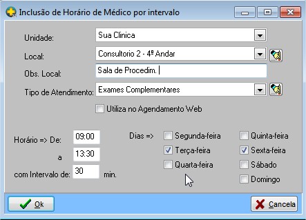 - Dias: Dias da semana que o médico atenderá naquela configuração.
