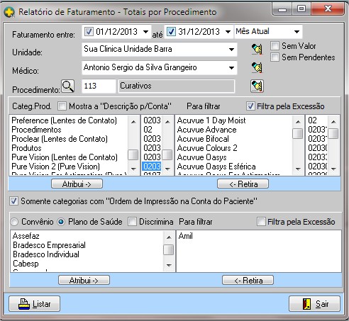 | Categ. Prod./Mostra a "Descrição p/ Conta | ao marcar esta opção o relatório incluirá todas as categorias de produtos relacionadas ao paciente, se desmarcada possibilita filtrar por categoria. |
