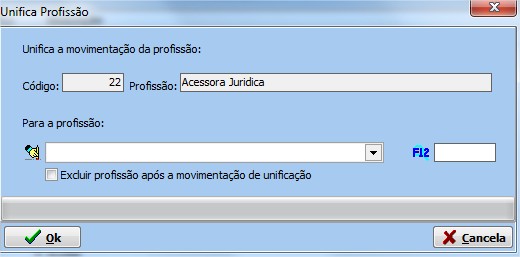 | Unifica a movimentação | Permite unificar a Profissão que deseja, basta informar para qual Profissão deseja unificar. |