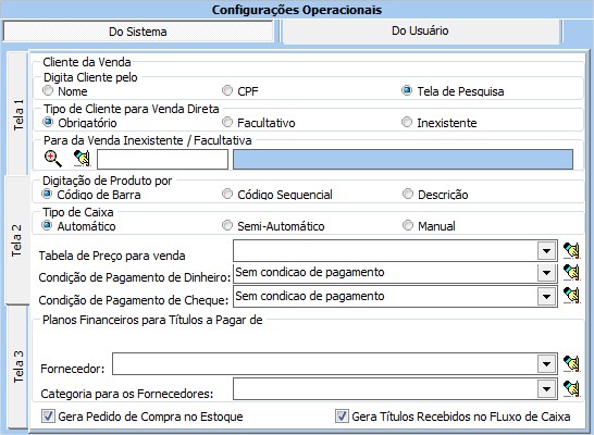 Tipo de Cliente para Venda Direta Permite definir o tipo de Cliente como Obrigatório , facultativo, ou Inexistente.