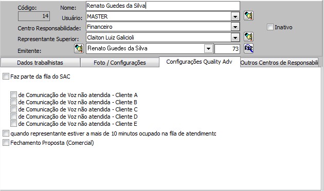 - Faz parte da fila do Sac: para incluir representante na fila do Sac.
