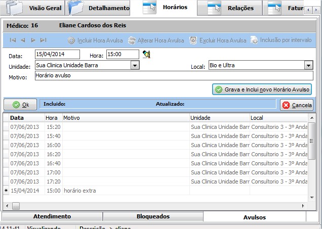 | 5º | Feito isso, você terá definido 1 horário para esse dia, por exemplo 10:20. Se desejar incluir 10:40(exemplo), basta clicar no botão Grava e Inclui novo Horário Avulso. |