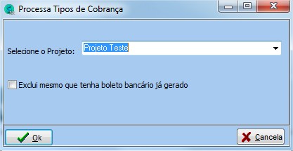 |1º|| Caminho: | |1º|| Caminho:[[Sistemas Cash Master Advanced]] > [[Utilitários Cash Master Advanced]]> [[Processamentos]] > [[Processamentos Tipos de Cobrança]], selecione o projeto, pressione o botão Ok, o sistema questionará a confirmação, pressione o botão sim para confirmar a geração dos títulos. | ||