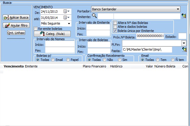 | 2º | Informe o período, portador, pressione o botão aplicar busca, seleciona o emitente, pressione o botão listar > Boleta com código de barras > Impressora > Imprimir. |