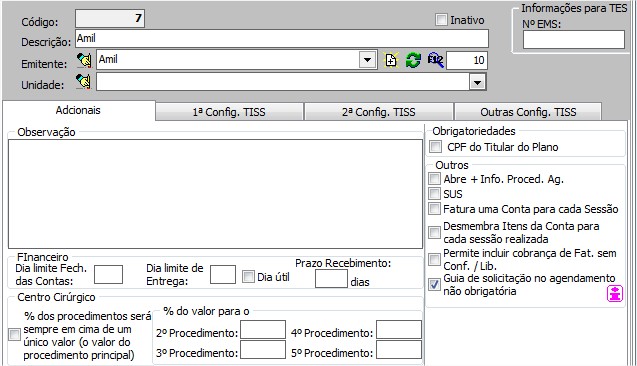 Financeiro-Permite informar o Plano financeiro, o Portador, a Empresa, Prazo de recebimento, dia do Fechamento, Usar o CH, Código Filme(TISS), Valor do Filme e Custo Operacional. Outros - Permite informar observações sobre o Plano(será visualizado pela recepção no agendamento), informar os sub planos e classificar. Permissões- Permite informar a quantidade de dias para retorno, quantidade de atendimento no mês para o mesmo paciente, quantidade de atendimento geral no mês, quantidade de atendimento geral no dia. Impostos- Permite informar o valor mínimo de guia, acima do valor informado,será descontado o IRRF, informar o percentual de desconto do IRRF.Informar o valor mínimo para impostos, acima do valor informado,vão incidir impostos, informar o percentual CSLL, informar o Percentual COFINS e PIS/PASEP.