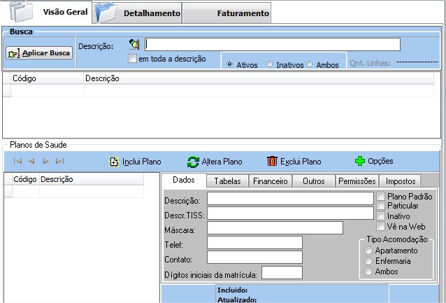 Dados Permite incluir dados referente ao plano como Descrição , a Descrição para Tiss.