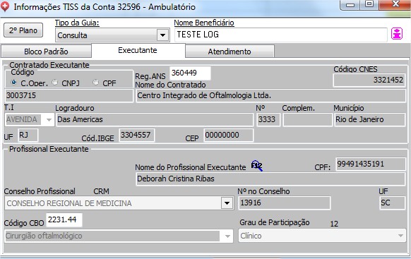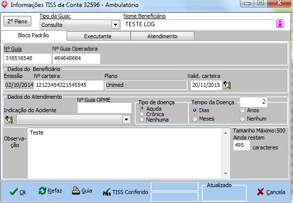 | Dados do Beneficiário | Permite informar/Conferir dados da carteira do Plano de Saúde do Beneficiário (Paciente). |